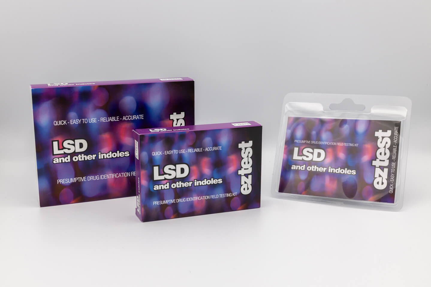 The LSD Testing Kit uses the Ehrlich reagent, which is sealed inside a glass ampoule. When a sample containing an indole substance is added, a chemical reaction occurs, resulting in a colour change. This colour can then be matched against the provided colour chart to give an indication of what might be present in the sample.